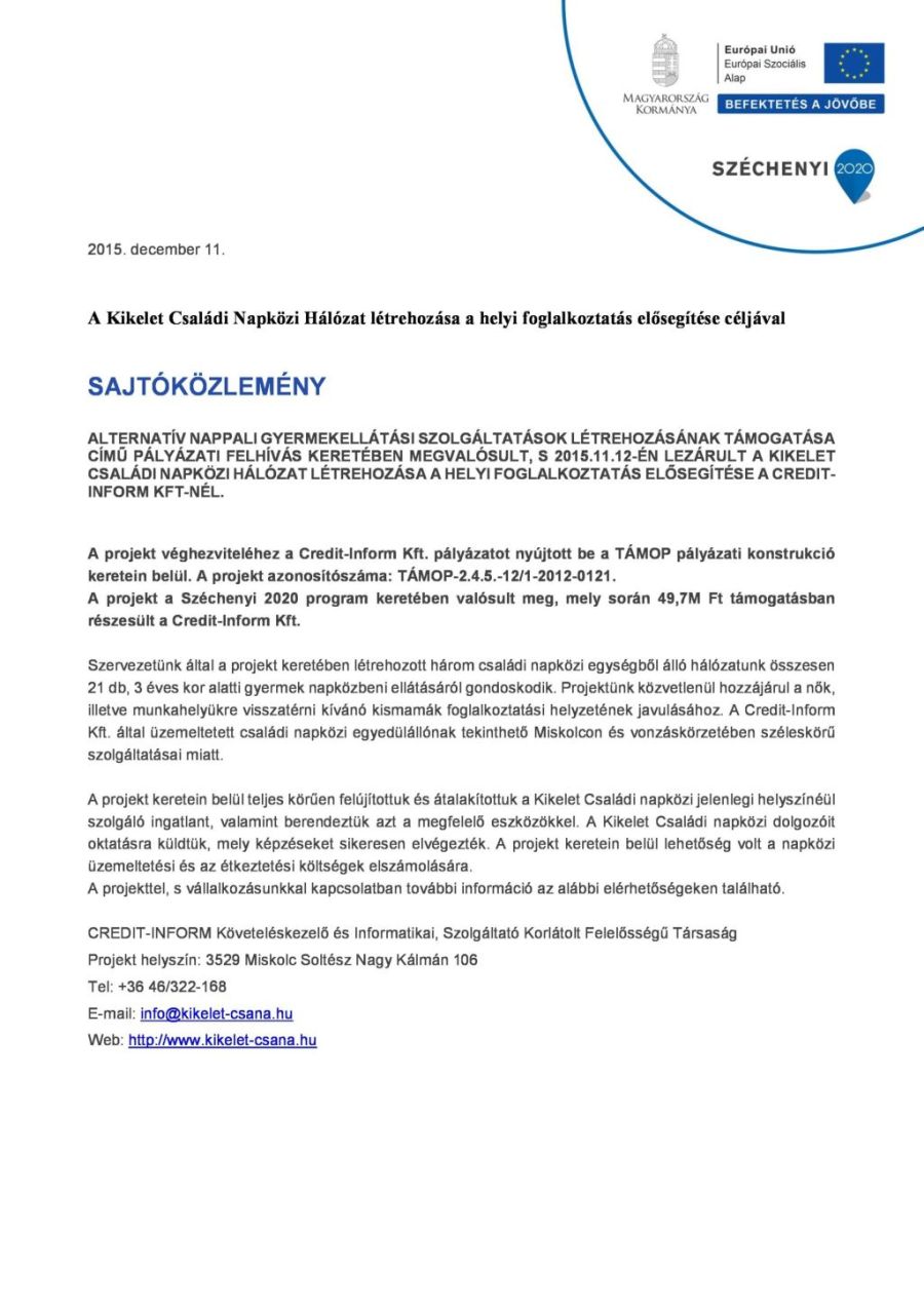 A Kikelet Családi Napközi Hálozat létrehozása a helyi foglalkoztatás elősegítése céljából.